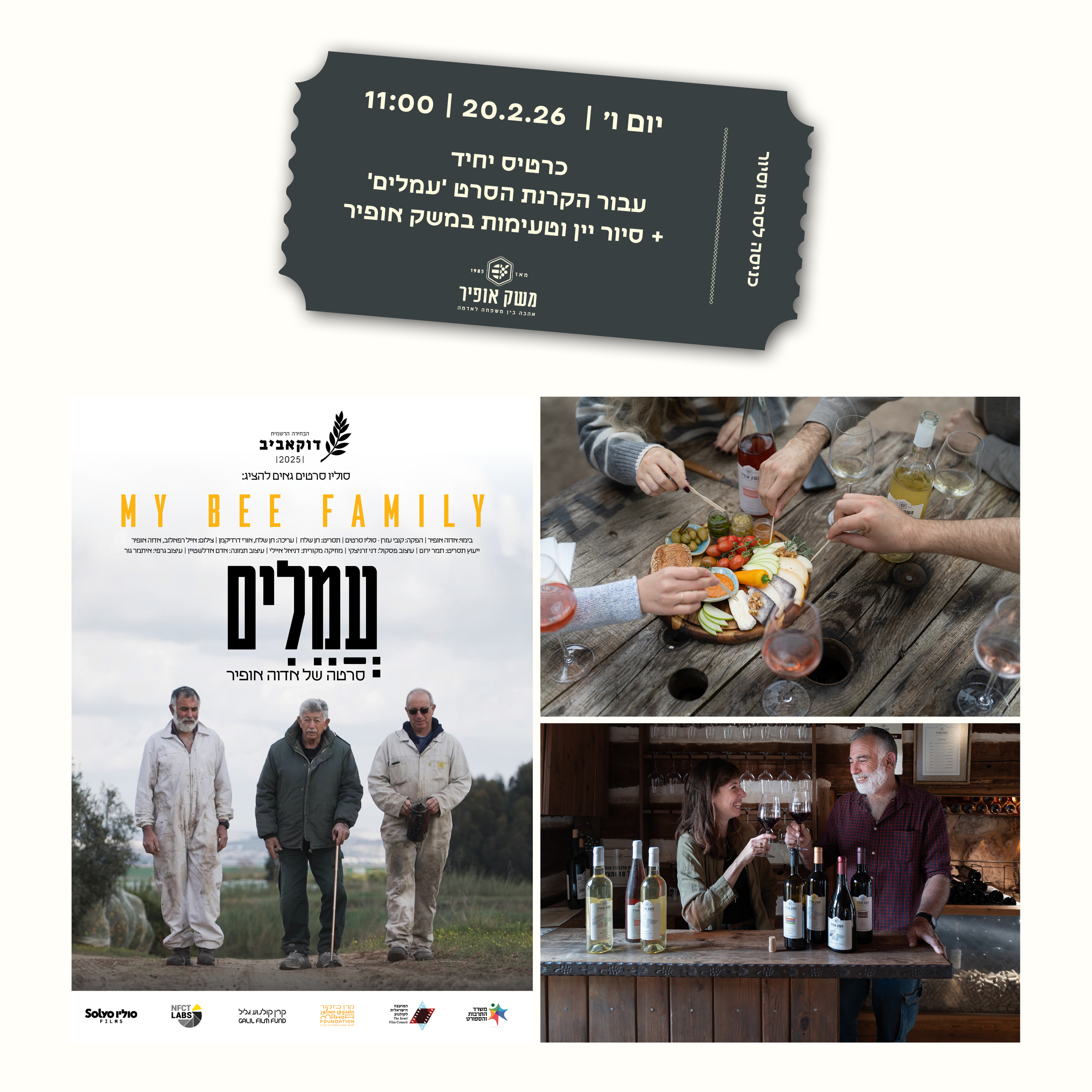 כולל הקרנה חגיגית של הסרט ‘עמלים’ ביקב משק אופיר + סיור יין עם טעימות מודרכות ובראנץ’ גבינות